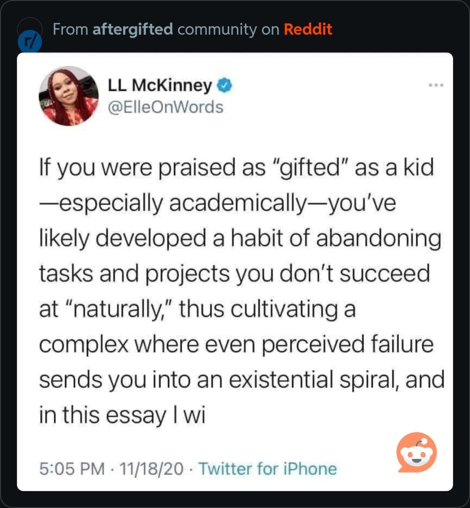 Na Reditu imate ceo kanal koji se zove aftergifted, i tamo su okupljena sva nesrećna pametna, nadarena deca koju je sistem olupao, ili što ja kažem samleo. Kad sam prvi put našla ovaj kanal prvo sam se mnogo smejala, a posle sam želela samo da plačem danima. Kroz srednju i osnovnu školu prošla sam kroz pakao neprekidnog plakanja, perfekcionizma i anksioznosti (za to tad nije ni postojalo ime verujte mi, ako jeste zvalo se lenjost) i ko što rekoh, nesposobnosti da podnesem bilo kakvu (svoju i tuđu) osrednjost. Ako mi odjednom nije išlo savršeno, padala sam u totalni očaj.